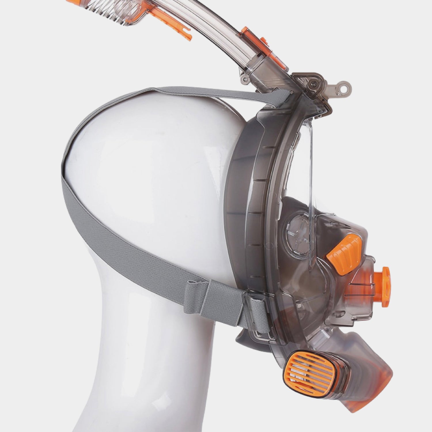 Designed for surface snorkeling or paired diving with a mini tank, the M8038 full-face snorkel mask allows you to breathe from the mouth or nose without having to bite down on a mouthpiece. The wide panoramic lens gives you a full 180° field of view, while the anti-fog airflow system keeps your vision clear and your breathing natural.