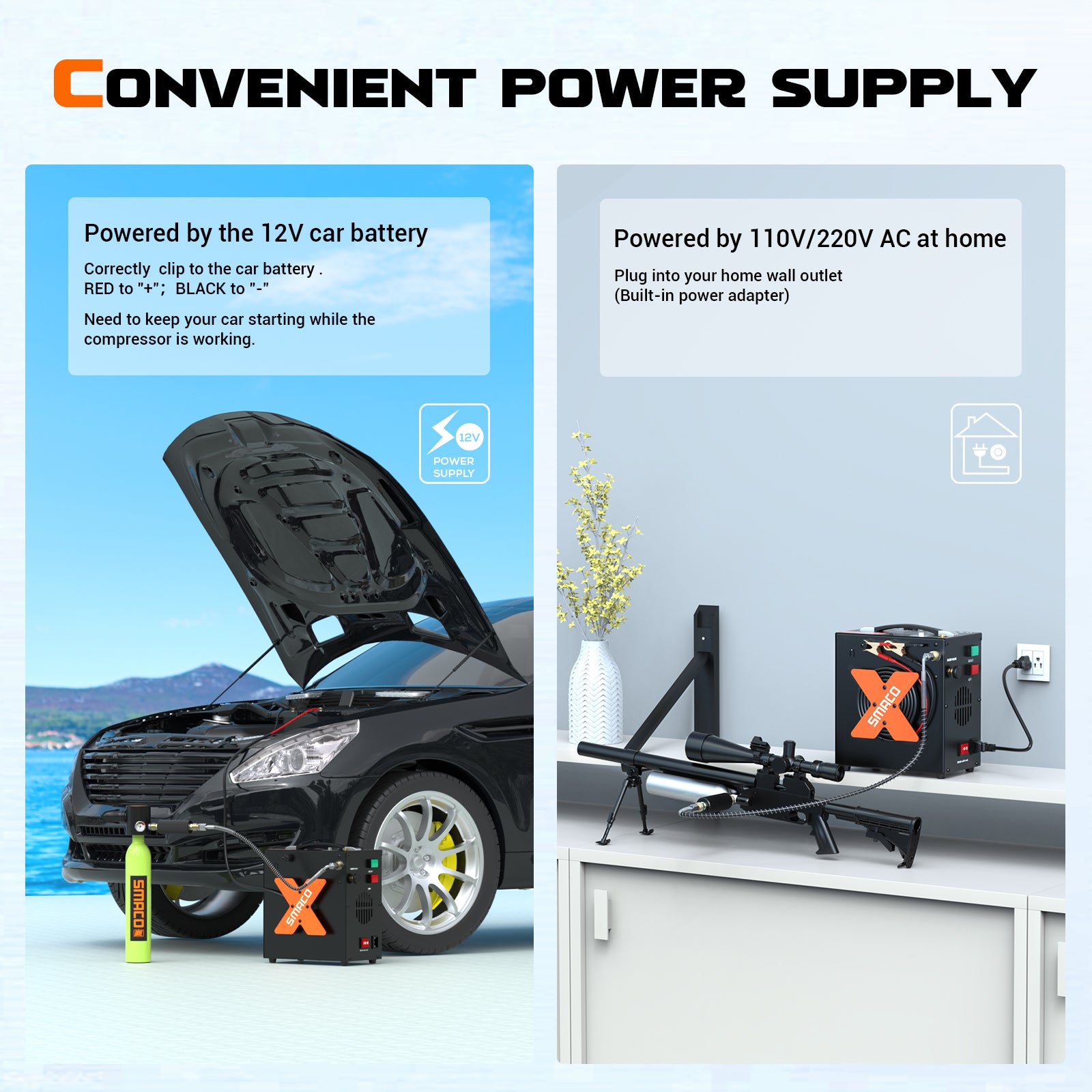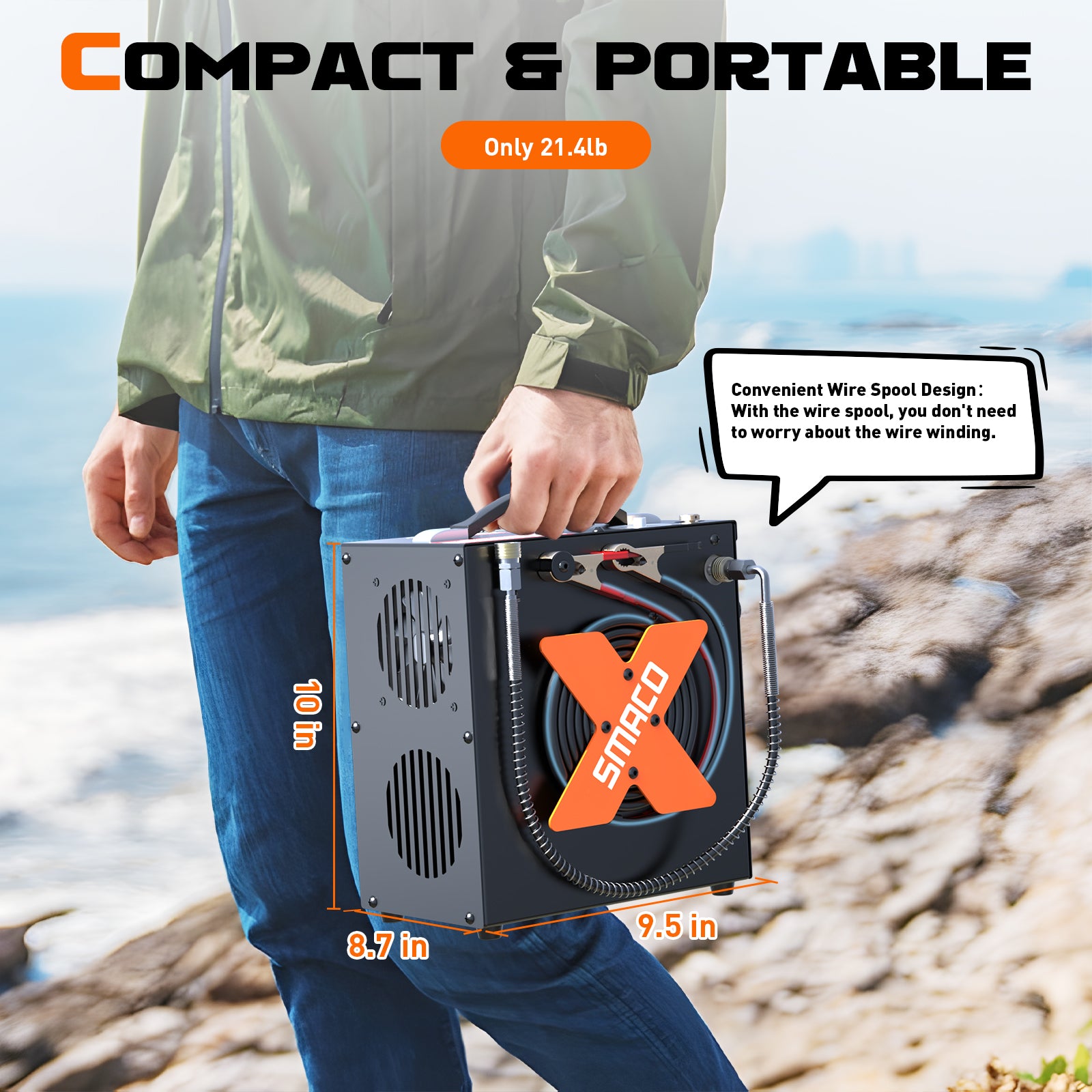 The SMACO electric air compressor is very compact and portable, making it suitable and convenient for filling your PCP or scuba tank anywhere. The compressor is designed with a professional transformer that can decrease current loss and avoid damage to the pump to increase its service life.