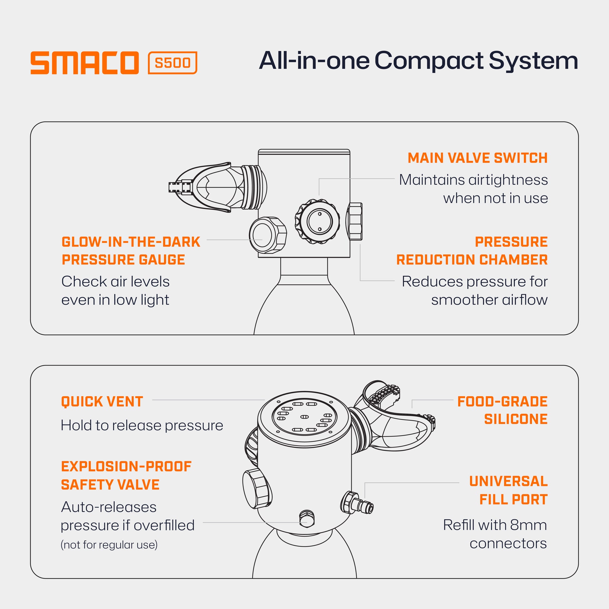 The S500 pairs smooth, controlled airflow with a 0.7L cylinder. Built for quick dives and reliable backup use, it features a main valve switch that maintains airtightness when not in use—preserving air and peace of mind. Its integrated respirator houses the regulator, gauge, safety valve, vent, and mouthpiece in one streamlined unit, keeping your setup simple, portable, and always ready for adventure.